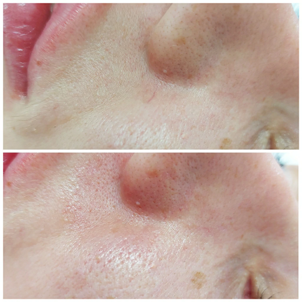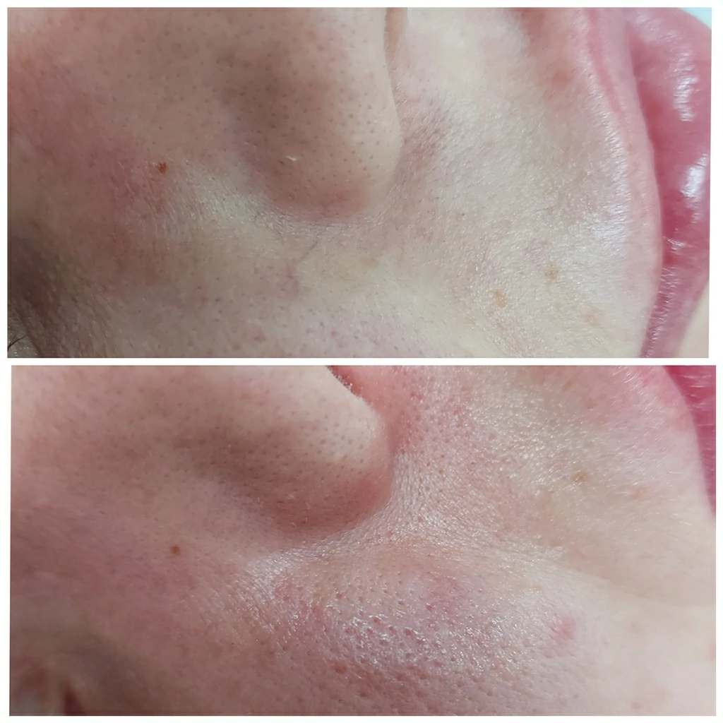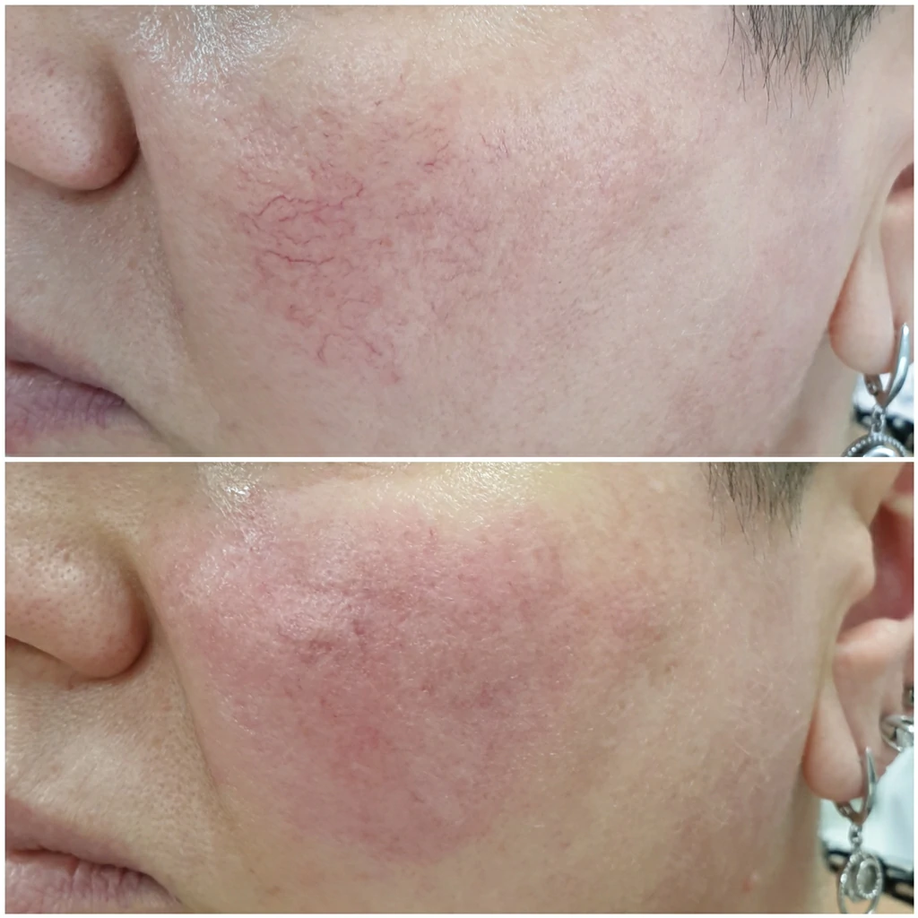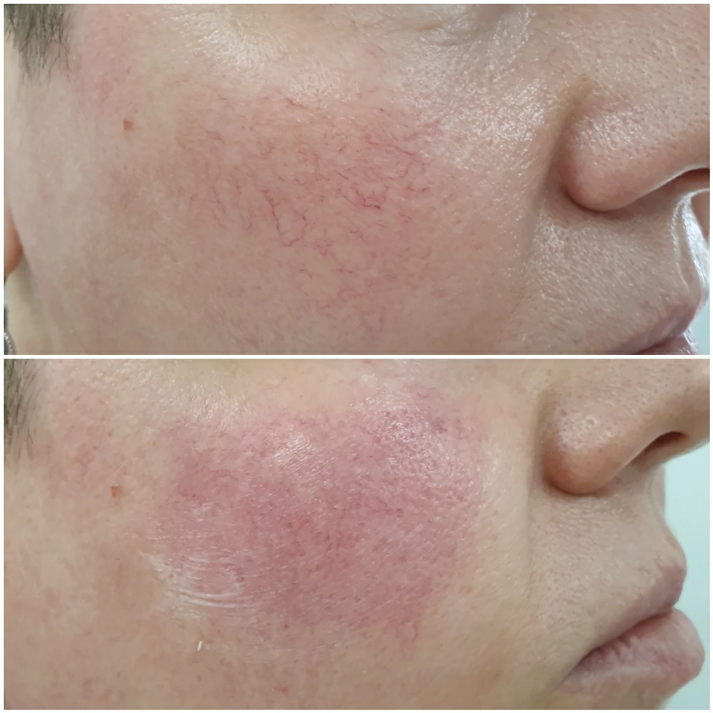 Эффект виден сразу. Уже в день процедуры окружающие заметят, что ваша кожа обрела ровный тон, а сосудистый рисунок исчез бесследно.